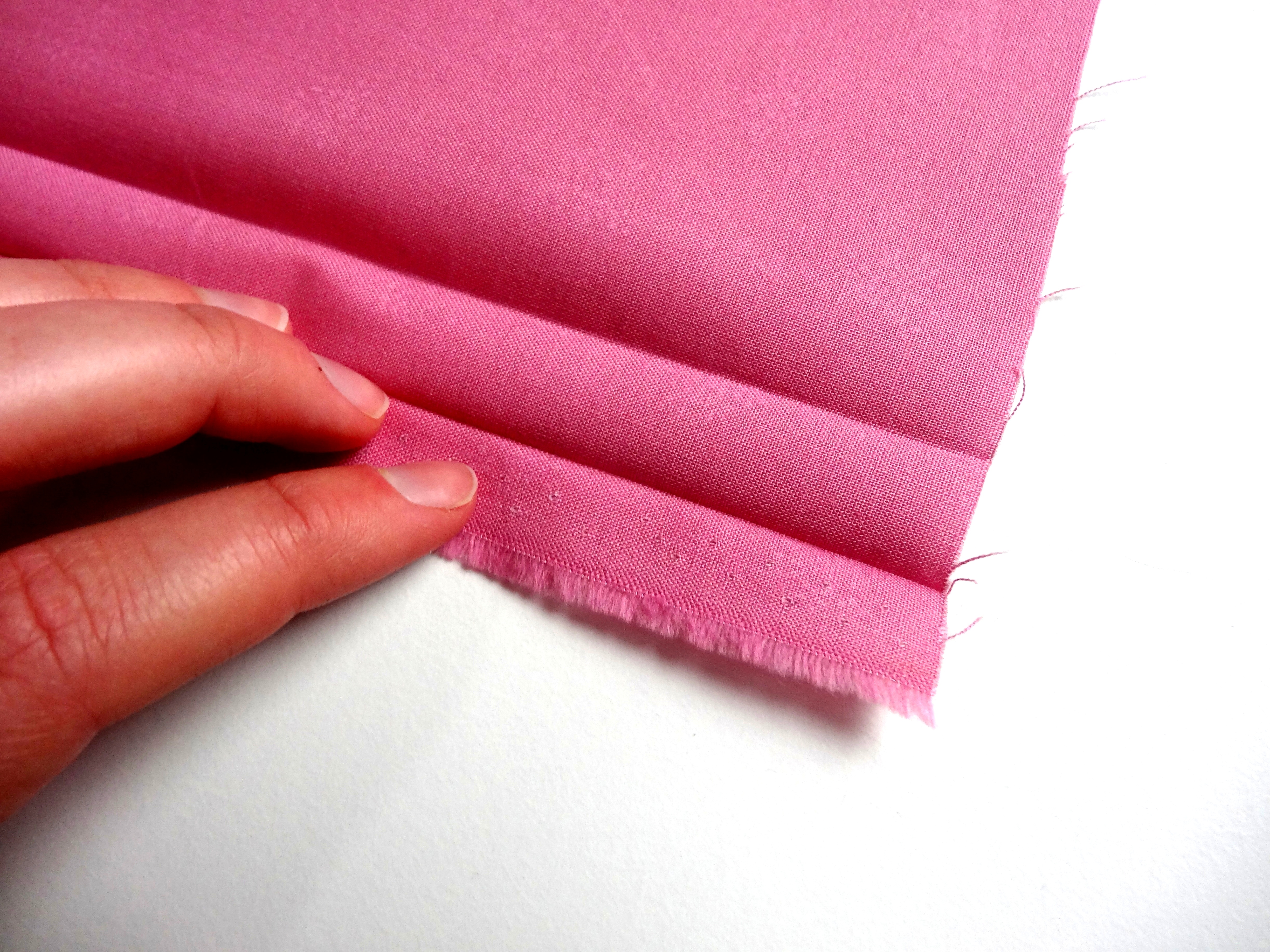 Durch das Fixieren mit Stecknadeln können im Stoff unschöne Einstichlöcher entstehen und die einzelnen Fäden im Stoffgewebe verschieben sich etwas, wie Du auf dem Bild erkennen kannst. Aber das lässt sich sehr leicht beheben!