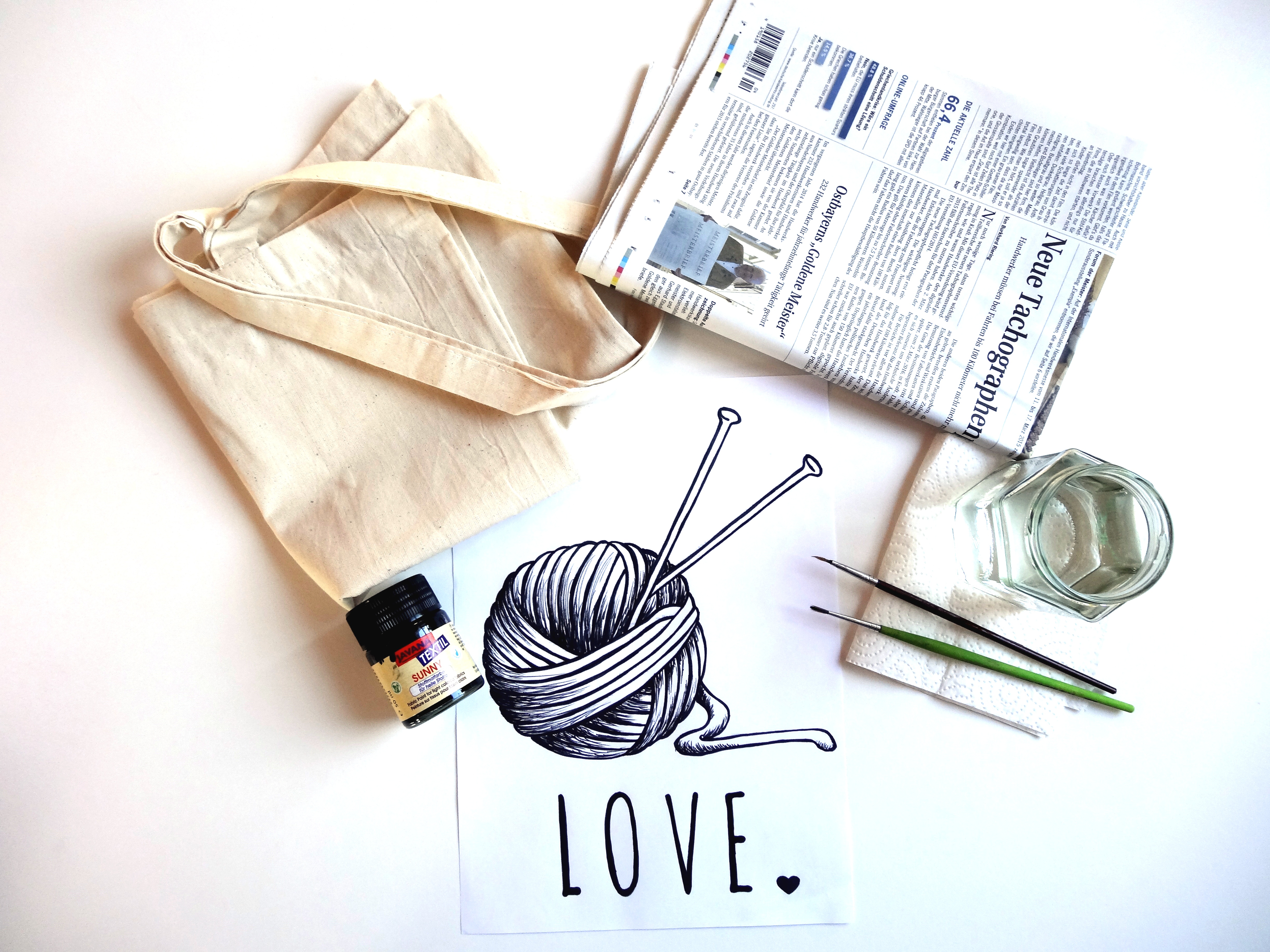 Das ausgedruckte Motiv legst Du jetzt so in den Jutebeutel, dass es an der Wunschposition platziert ist und leicht durchscheint. Deshalb ist es sehr wichtig, dass Du es auf weißem Papier in schwarz ausdruckst. Am besten ziehst Du die Linien vorher nochmal mit einem kräftigen, schwarzen Filzstift nach, damit sie auch gut sichtbar sind.