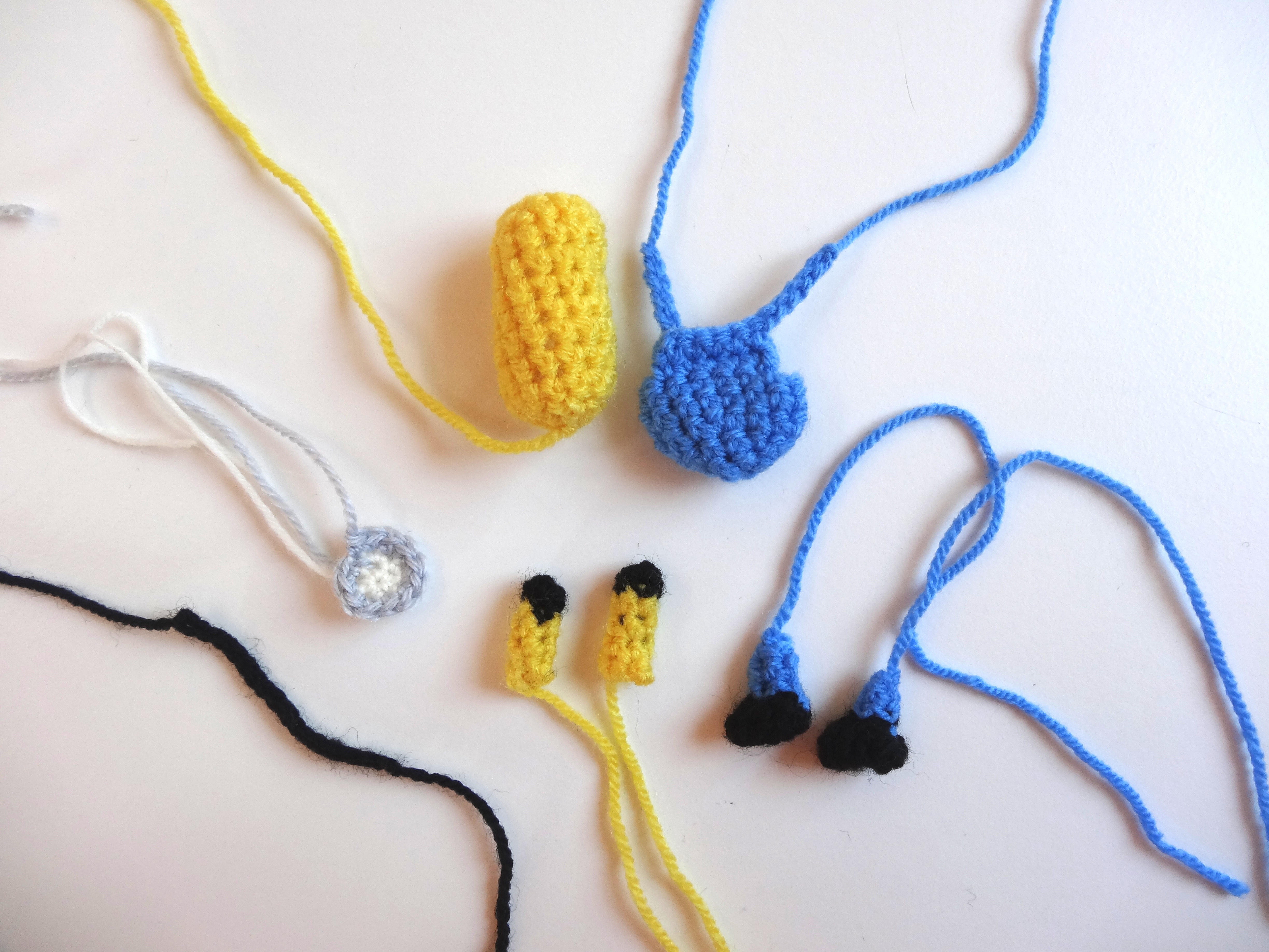 Die Anfangs- und Endfäden an den Einzelteilen des Minions dürfen ruhig etwas länger sein und werden erst ganz am Ende vernäht. Du kannst sie wunderbar dazu verwenden, die Einzelteile zusammenzunähen! Und jetzt geht’s los: