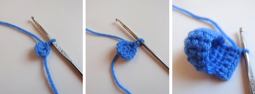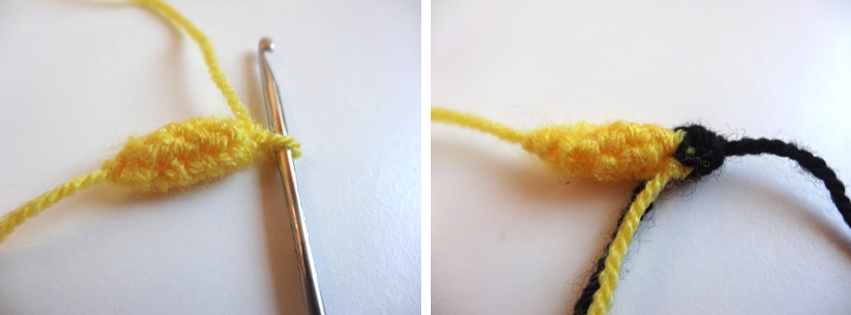 Für ein Minion-Bein beginnst Du mit einem 5er Maschenring mit schwarzem Garn, das Wird der Schuh. Du häkelst in Runden und stichst in der ersten Runde nur in die ersten drei Maschen doppelt ein.