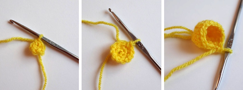 Der Minion Körper besteht eigentlich nur aus einem längeren Schlauch-Stück, an dem oben und unten je eine Halbkugel den Anfang und den Abschluss bilden. Du beginnst mit einem Maschenring aus 5 festen Maschen. Ab der ersten Runde stichst Du in jede Masche zweimal ein, in der zweiten Runde nur in jede zweite Masche zweimal, aber nur bis Du insgesamt in der Runde 13 feste Maschen hast.