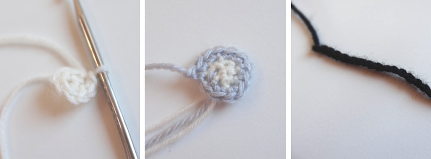 - Ein wenig schwarze, weiße und graue Wolle für die Details (Stärke 2,5-3).