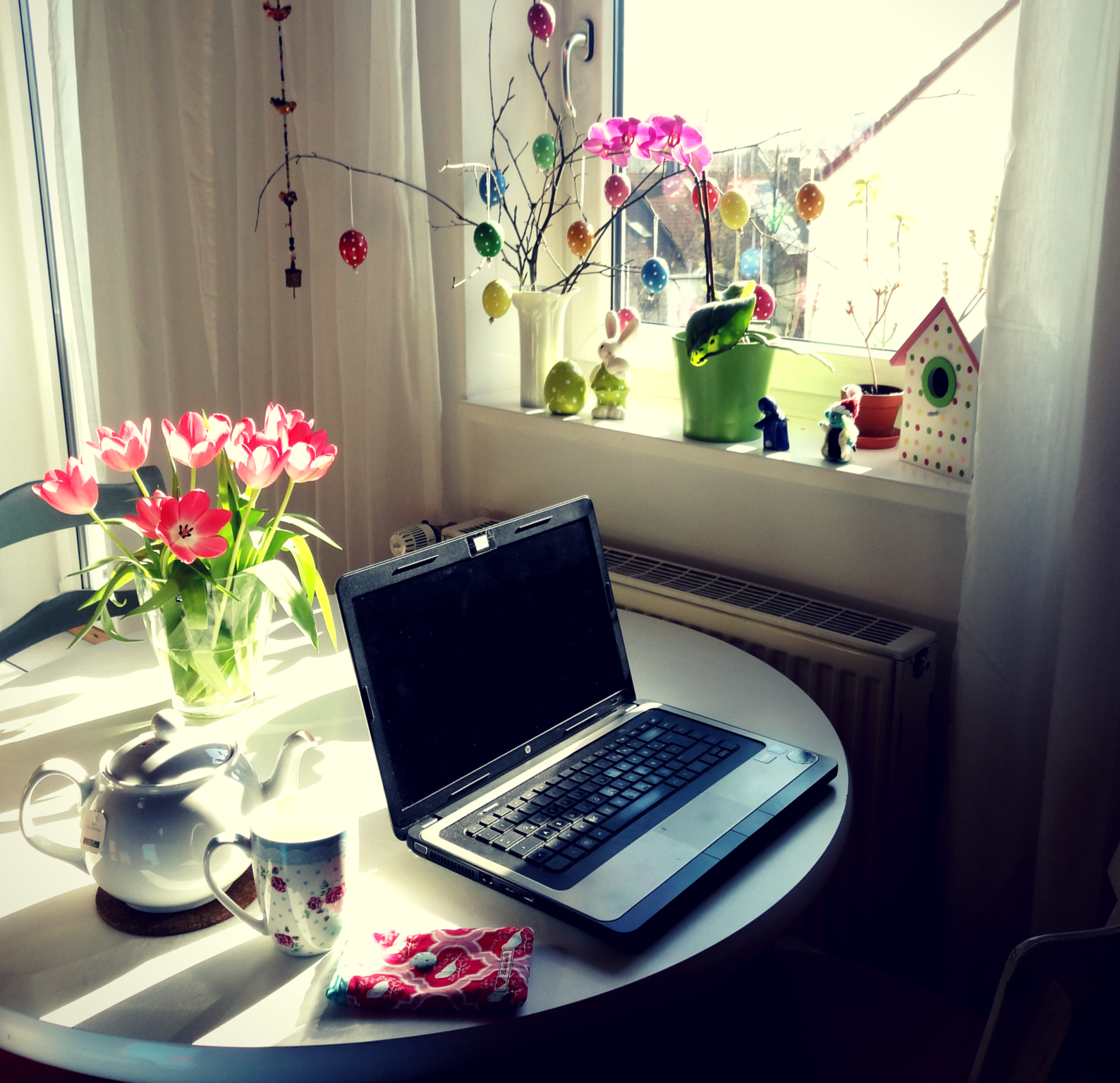 Hier siehst Du meinen Arbeitsplatz, an dem ich auch meine Produkte fotografiere. Ein weißer IKEA-Tisch vor einem Fenster, also kommt viel Tageslicht rein. Leider habe ich in meiner Wohnung keinen Platz, mir ein dauerhaftes kleines “Studio” einzurichten. Außerdem finde ich Tageslicht-Bilder eh viel schöner. Meine Produkte fotografiere ich also auf diesem Tisch.