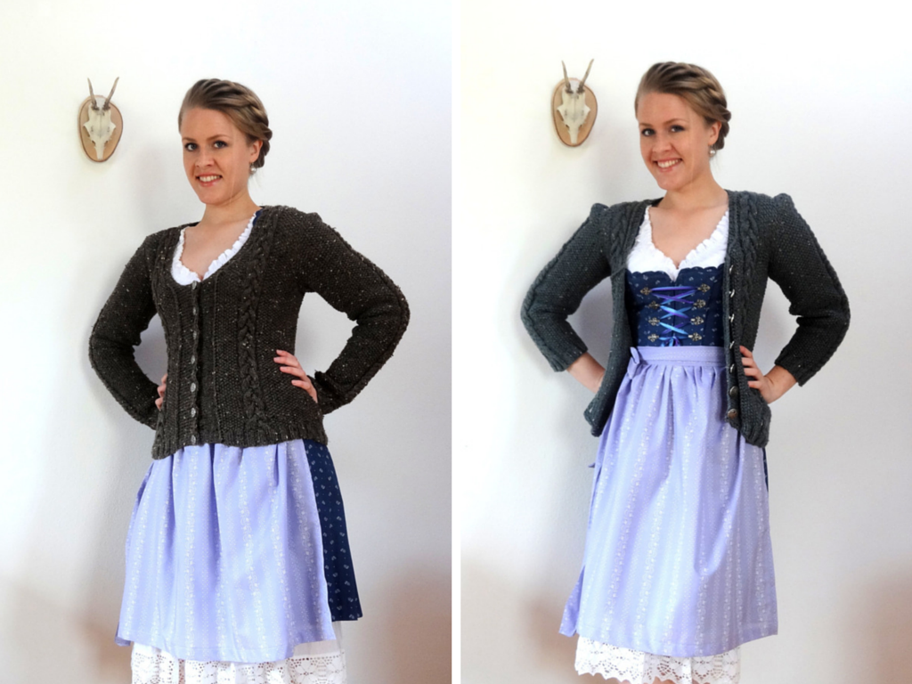 meinen Tisch, darauf diverse Schachteln und obenauf meine Kamera. Dann ist Selbstauslöser-Time. Anstrengend ist das schon, weil ich ja immer wieder zur Kamera laufen muss, um wieder den Auslöser zu betätigen. Aber ich weiß eben selbst am besten, wie ich die Bilder gerne hätte. Hierzu sehe ich mir die Bilder immer wieder an, und wenn mir eins besonders gut gefällt, versuch ich mir die Körperhaltung einzuprägen und beim nächsten zu imitieren. Zwar sieht man beim linken Bild den selbst gestrickten Damenjanker schön, aber irgendwie trägt er zugeknöpft ein bisschen auf. Rechts stehe ich nur minimal anders, schiebe mein linkes Bein und die rechte Schulter vor und trage den Janker offen. Dann sieht man auch die selbstgenähte Dirndl-Schürze schön.