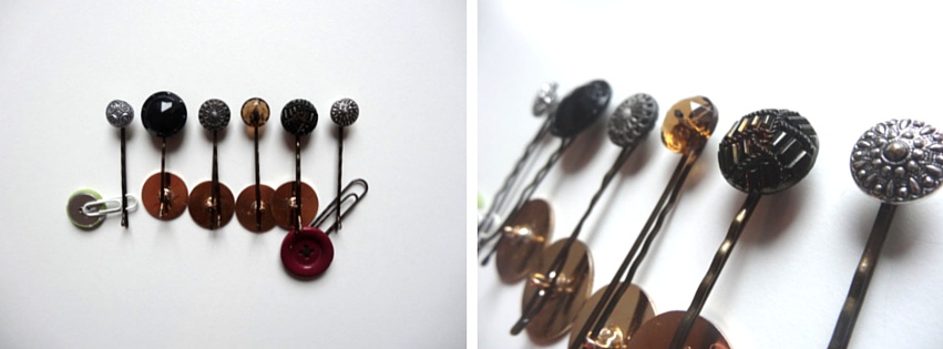 Ich nehm jetzt mal als Beispiel die Bilder der Knopfbastelei-Bobbypins. Die wollten einfach nicht so, wie ich wollte! Immer sind sie umgekippt und wollten partout nicht in Reihe liegen. Also hab ich die unteren Enden durch die Ösen umgedrehter Knöpfe gefädelt.
