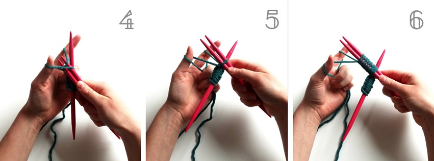 5. Bei der jeweils ersten Masche auf der „neuen“ Nadel, ziehst Du die Fäden besser etwas fester, damit keine Lücke beim Übergang zur neuen Nadel entsteht.