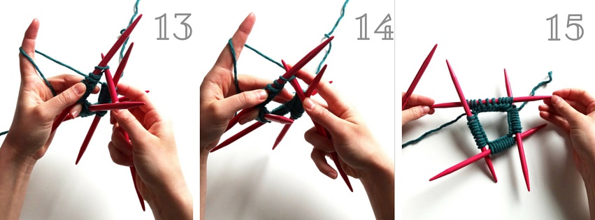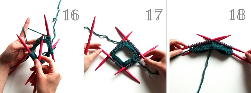 15. Jetzt hast Du ein geschlossenes Viereck. Die Nadel, an deren Ende der Arbeitsfaden hängt, hast Du immer als letztes abgestrickt. Die nächste Nadel ist immer die links zu der, an deren Ende der Arbeitsfaden hängt.