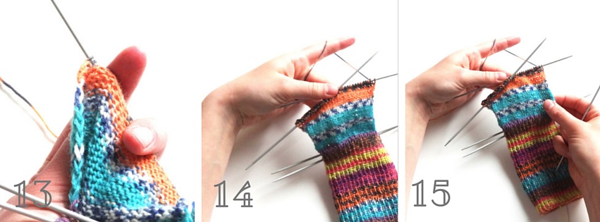 12. Die Ferse strickst Du so lange weiter, bis Du insgesamt 13 Randmaschen (also 26 Reihen) hast. Ich zähle bei solchen Strickarbeiten immer die Randmaschen, das geht leichter als Reihen zu zählen.
