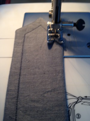 Die Epaulette entlang der Längskante und der Spitze füßchenbreit absteppen. Dazu nimmst Du am besten Garn, das farblich dem Stoff entspricht. Ich habe nur deshalb dunkles Garn genommen, damit die Naht auf den Fotos gut zu sehen ist.