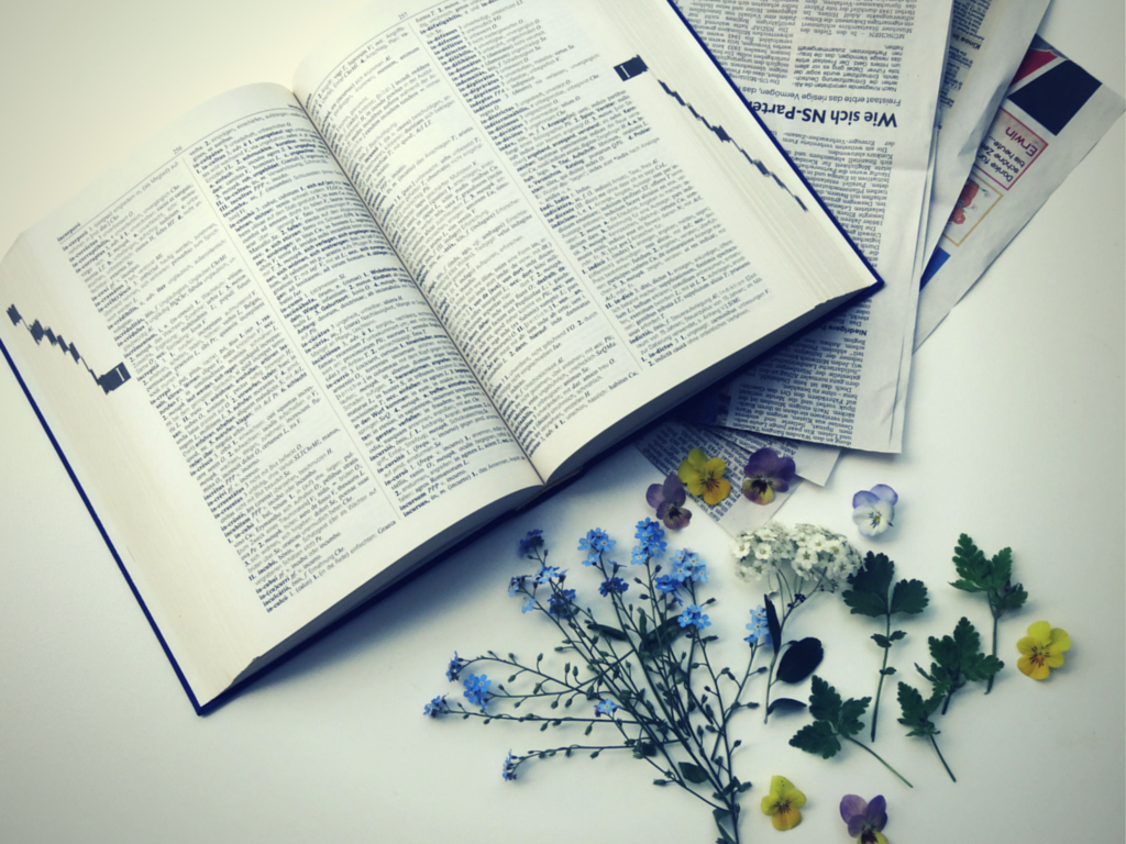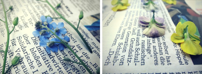 Die gesammelten Blüten und Blätter werden jetzt zwischen Zeitungspapier gepresst. Das dauert je nachdem, wie dick die Blüten sind, etwa eine Woche. Du schlägst Dein großes Buch auf und legst Zeitungspapier hinein. Dann platzierst Du die Blüten mit der Vorderseite nach unten und einigem Abstand zueinander auf der rechten Seite des Zeitungspapiers.