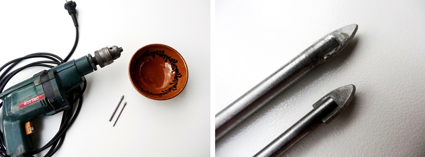 Anleitung: DIY vintage Etagere aus SammeltassenDann kommt das Bohren. Je nach Material des Porzellans kann das etwas dauern. Ich will hier echt nichts beschönigen: Gefühlt hat es ewig gedauert! Und ich bin doch so ungeduldig! Ich hab an allen drei Teilen insgesamt bestimmt 20 Minuten rumgebohrt.