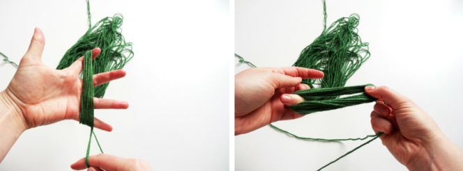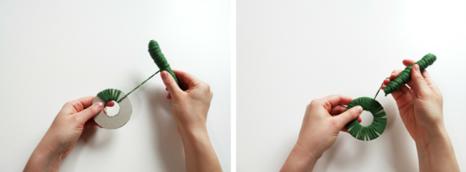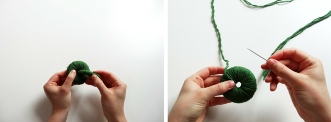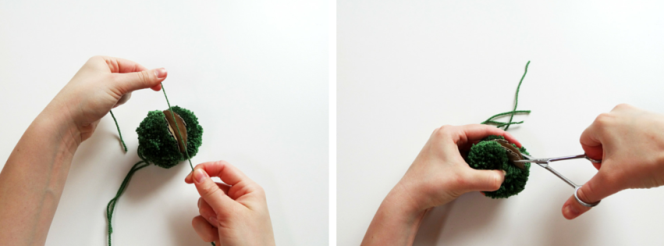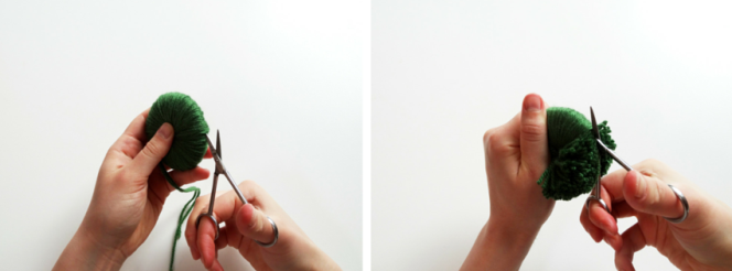 bommel, pompom 1Lisitipp vorab: Egal in welcher Größe Du den Bommel machst, der Durchmesser der Pappscheibe sollte doppelt so groß sein, wie der Durchmesser des Loches in der Mitte der Pappscheibe. Bei mir sind es 8cm und das Loch in der Mitte 4cm. Das Verhältnis ist wichtig, damit Dein Bommel auch schön fett und stabil wird. Ist das Loch zu klein, wird er ziemlich mickrig mit nur wenig Wollfransen, ist das Loch zu groß, wird er ziemlich unförmig.bommel, pompom 2Erstmal wickelst Du die Wolle zur Hälfte ab, und legst die abgewickelten Stränge auf einen Haufen. Mit der anderen Hälfte machst Du es genauso. Dann nimmst Du die zwei Faden-Enden her, und wickelst sie um die gespreizten Finger der linken Hand, so wie Du es auf dem Bild siehst.bommel, pompom 3Du wickelst so ungefähr 10 mal rum, dann nimmst Du den gewickelten Strang, und fängst an, ihn der Länge nach ganz fest mit der restlichen Wolle zu umwickeln.bommel, pompom 4Hierbei wickelst Du nicht immer um die gleiche Stelle, sondern Du wickelst immer von oben nach unten, Schicht für Schicht und so fest Du kannst. Indem Du dieses längliche Wollknäuel aufwickelst, sparst Du Dir später eine Menge Zeit. Ein rundes Knäuel wäre mit der Menge an Wolle viel zu dick und würde nichtmehr durch das Loch in der Mitte passen.bommel, pompom 5So entsteht allmählich Dein längliches Wollknäuel, mit dem Du dann ganz einfach die Pappscheiben für den Bommel umwickeln kannst. Es darf natürlich nicht dicker sein als das Loch in der Mitte, sonst passt es ja nicht durch!bommel, pompom 6Dann nimmst Du die Pappscheiben her, wickelst die Fadenenden einmal rum, und fixierst sie mit dem Daumen der linken Hand, bis Du einmal drübergewickelt hast. Jetzt geht das Wickeln los. Hierzu führst Du dein langes Wollknäuel immer wieder von hinten nach vorne durch das Loch in der Mitte, und umwickelst so die Pappscheiben im Uhrzeigersinn Schicht für Schicht und möglichst gleichmäßig dick.bommel, pompom 7Während Du immer weiter rum kommst, wickelst Du immer wieder Stück für Stück etwas von Deinem Knäuel ab. Du könntest das auch ohne dieses lange Wollteil und nur mit einem langen Fadenstück machen. Allerdings würde sich dann der lange Faden immer wieder verheddern. So kommst Du viel schneller voran und kannst ein sehr langes Stück Faden an einem Stück drumrum wickeln. Dadurch, dass Du den Faden doppelt aufgewickelt hast, geht es auch dementsprechend doppelt so schnell als nur mit einem Faden.bommel, pompom 8Du wickelst so lange rum, bis sich Dein Knäuel fast aufgelöst hat, und nichtmehr stabil ist. Dann wickelst Du das Knäuel wieder ganz auf und nimmst eine Stopfnadel zur Hand für den Rest. Jetzt sollte sich Dein Faden auch nichtmehr allzusehr verheddern können, was die Länge angeht.bommel, pompom 9Wenn Dir der Faden ausgeht, nimmst Du noch ein wenig dazu. Du wickelst so lange, bis wirklich keine Öffnung mehr zu sehen ist. Wenn die Nadel fast schon stecken bleibt, und der Wollfaden gerade noch so durchgeht, bis Du fertig mit der Wickelei!bommel, pompom 14Dann schneidest Du entlang der Außenkante der Pappscheiben die Wolle auf. Wenn Du mal bis zur Mitte durch bist, kannst Du die Schere zwischen den Papphälften ansetzen zum Schneiden, das geht leichter. Zwischen den beiden Pappteilen wird die Schere quasi „geführt“ und Du schneidest immer an der richtigen Stelle die Fäden auseinander.bommel, pompom 11Wenn Du einmal ganz rundrum bist mit Schneiden, biegst Du die Papphälften etwas auseinander, und nimmst ein extra Stück Faden der selben Farbe her (ca. 20 cm lang). Das Fadenstück wickelst Du dann um die Mitte zwischen den Pappscheiben, und machst einen sehr festen Knoten rein. Er muss wirklich sehr fest sein, denn er hält ja den Bommel zusammen! Wäre er zu locker, würden sich nahc und nach einzelne Fransen aus dem Bommel verabschieden.bommel, pompom 12 Die Fadenenden schneidest Du nicht ab, die kannst Du noch super verwenden, um den Bommel später anzunähen – an eine Mütze zum Beispiel. Dann zerschneidest Du die Pappscheiben mit der Schere und ziehst sie vorsichtig raus. Tadaaa – jetzt ist er so gut wie fertig!bommel, pompom 13Jetzt ist der Bommel vielleicht noch etwas unförmig. Du kannst ihn noch ein bisschen mit der Schere zurechtstutzen hier und da, Du siehst ja, wo er noch ein bisschen zu lange Fransen hat.