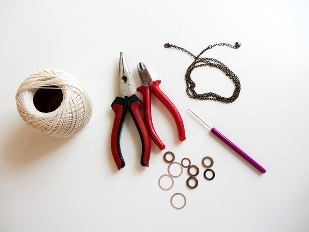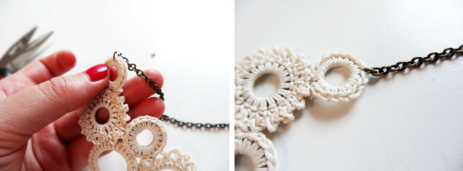 Mit der Spitzzange biegst Du jetzt zwei Ketten-Ringe auf, die brauchst Du zum Befestigen. Du fädelst einen der kleinen Ringlein durch eine feste Masche des äußersten Häkelrings, an dem die Kette befestigt werden soll.gehaekelte statement kette ringe 7Jetzt legst Du den untersten Kettenring von einer Seite der Gliederkette in das aufgebogene Kettenstück, und zwickst es mit der Spitzzange fest zusammen. Auf der anderen Seite machst Du es mit dem zweiten Teil der Gliederkette genauso.