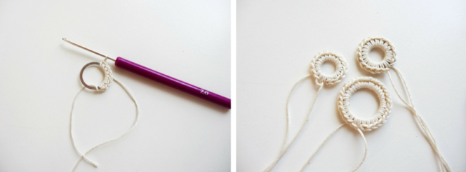 Rechts: Zusätzlich zu den 10 umhäkelten Metallringen hab ich noch zwei zusätzliche Elemente mit einem einfachen Maschenring gehäkelt (wie so ein Maschenring geht, findest Du in dieser Anleitung hier beschrieben).gehaekelte statement kette ringe 4Wenn Du fertig bist, musst Du nur noch die Fäden der einzelnen Ringe auf der Seite vernähen, die später dann die Rückseite sein soll. Leg die einzelnen Häkelringe am besten mal so hin, wie Du sie später an Deiner Kette haben willst. Leg sie jetzt am besten schon mal so aneinander, wie du sie später haben möchtest.