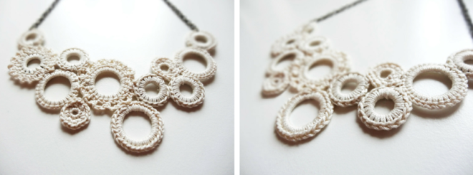 gehaekelte statement kette ringe 1Das Tutorial, bei dem ich mir Inspiration geholt habe, findest Du hier. Meine Kette ist etwas weniger dezent, funktioniert aber vom Prinzip her genauso.