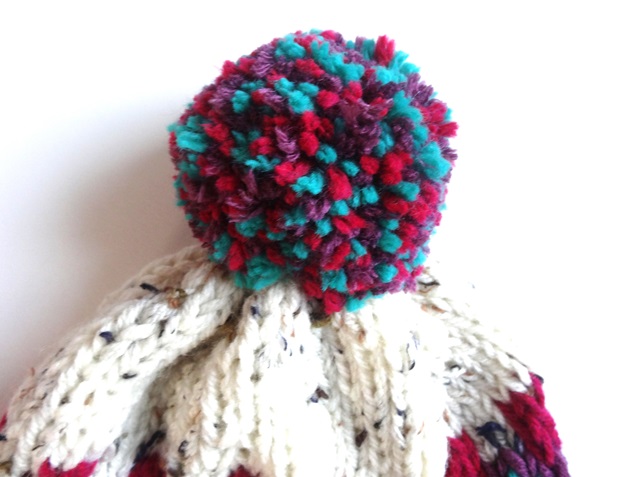 Für den Bommel nimmst Du meine tolle Bastel-Anleitung hier, und nimmst alle Farben außer weiß. Jetzt musst Du nur noch auf der Innenseite der Mütze die Fäden vernähen, den Bommel annähen und fertig!