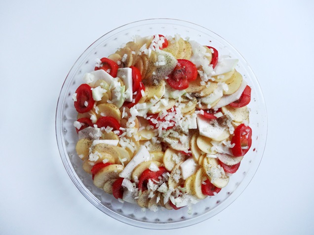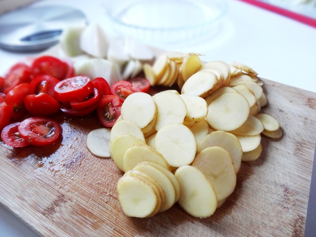 Die Kartoffeln und den Kohlrabi schälen und in sehr dünne gleichmäßige Scheiben schneiden, damit die später gut gar werden im Ofen. Ihr könnt sie auch mit einem scharfen Küchenhobel in Scheiben hobeln, das geht schneller. Die Tomaten ebenfalls in Scheiben schneiden. kartoffel kohlrabi tomaten gratin vegan rezept 2kartoffel kohlrabi tomaten gratin vegan rezept 6Dann alles in die etwas eingeölte Gratin- oder Auflaufform schichten. Hierbei immer schön abwechselnd die Tomaten-, Kartoffel- und Kohlrabischeiben verteilen, damit man später auch bei jedem leckeren Bissen von Allem was hat.