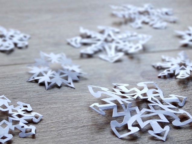 Wenn Du die Schneeflocken aufgefaltet hast, musst Du sie vielleicht noch ein wenig platt drücken, damit sie später schön flach an den Fenstern befestigt werden können. Tesa-Film reicht hierfür vollkommen aus.