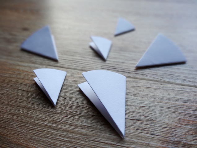 Die Kreise schneidest Du aus, das muss aber nicht unbedingt perfekt sein, grob reicht auch. Hauptsache, Du kannst sie dann schön falten: Erst einmal zur Hälfte, dann die Hälfte nochmal zu einem Viertel, dann das Viertel nochmal zu einem Achtel. Bis Du das mit allen ausgeschnittenen Kreisen gemacht hast, kann ein Weilchen vergehen …