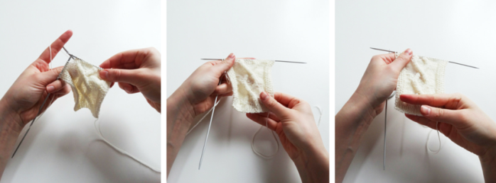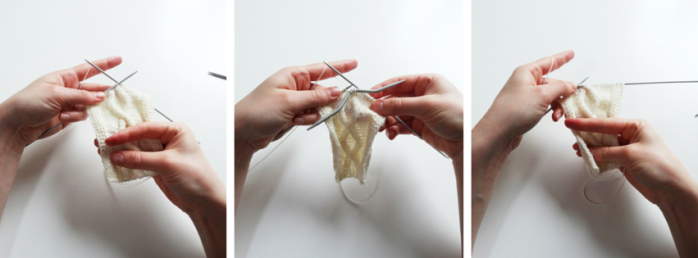 - Linke Maschen stricken, rechte Maschen abheben und vor die Arbeit legen, eine linke Masche aus der Mitte stricken, die rechten abgelegten Maschen stricken.