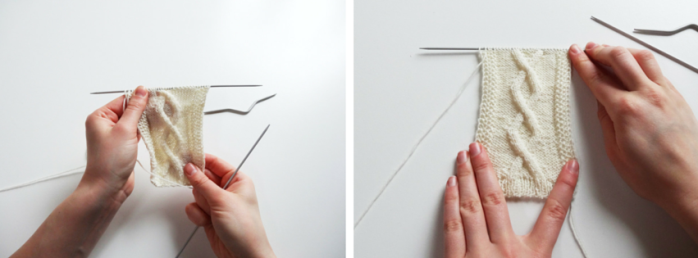 Das funktioniert genauso, wie der erste Teil des Musters, nur genau andersherum. Deine Maschenabfolge sollte jetzt folgende sein: 8 linke Maschen, 6 rechte Maschen, 8 linke Maschen.