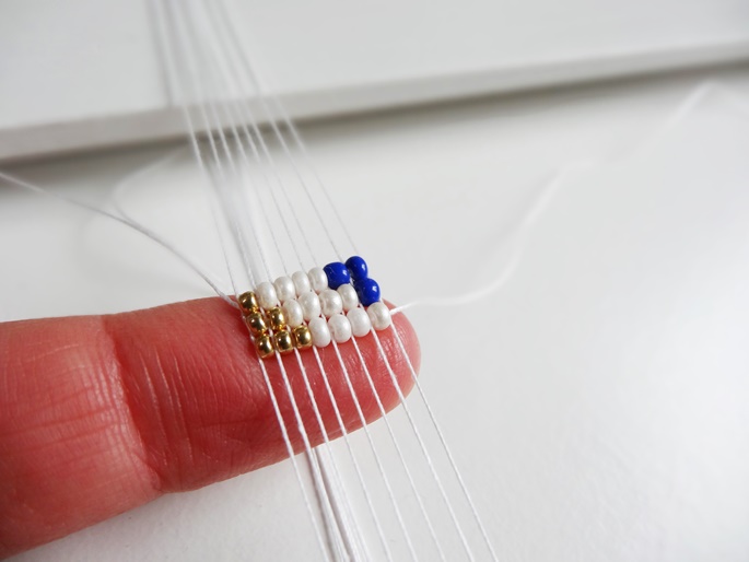 Dann führst Du diese Reihe aufgefädelte Perlen von links nach rechts gehend unter den Websträngen durch. Wenn Du mit dem linken Zeigefinger die Perlenreihe von unten anhebst, kannst Du Perle für Perle in die einzelnen Zwischenräume der Webstränge platzieren.