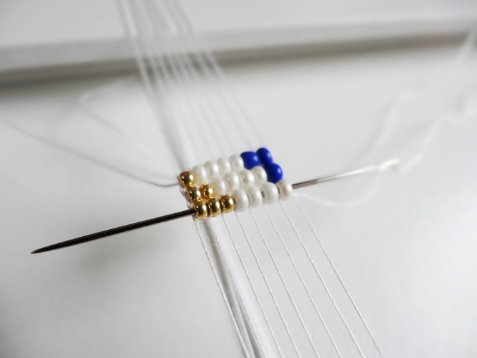 Lass vom Rahmen aus oben noch ca. 8-10 cm frei, damit es später für den Verschluss nicht zu knapp wird. Mit einer ganz feinen Nadel fädelst Du jetzt immer eine Reihe Perlen auf in der Abfolge des Musters, von links außen beginnend.