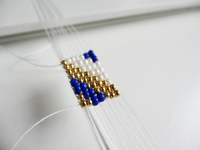 Immer, wenn Du den Faden wieder zum Fixieren durch so eine Perlenreihe gezogen hast, ist er ja wieder auf der linken Seite und Du kannst anfangen, eine neue Reihe aufzufädeln.