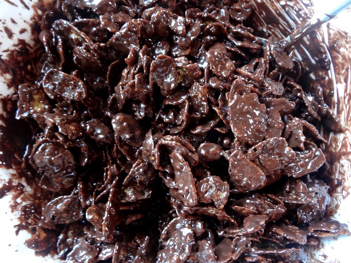 Jetzt schmilzt Ihr die Schokolade. Ich habe das früher immer im Wasserbad gemacht, aber in der Mikrowelle geht es viel schneller. Lest Euch den Zubereitungshinweis auf der Verpackung gut durch und achtet darauf, dass Ihr die Mikrowellen-Power ein bisschen runterdreht. Länger als 2-3 Minuten sollte es dann nicht dauern, bis die Schoki flüssig ist. Dann gebt Ihr die Hälfte zur Cornflakes-Nussmischung in die Schüssel, und hebt das Ganze immer wieder unter, bis sich die Schokolade gut über allem verteilt hat. Wenn Ihr noch ein bisschen Schokolade braucht, gebt ruhig noch etwas dazu.