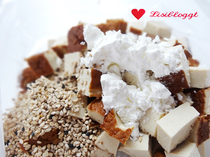 Zum Tofu kommt jetzt jeweils ein Esslöffel Stärke, Sesam und Ahorn-Sirup hinzu. Wenn Ihr den Tofu etwas schärfer mögt, könnt Ihr noch einen halben Teelöffel scharfes Paprika- oder Chili-Pulver hinzugeben.