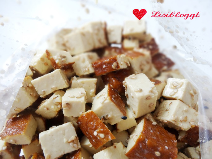 In der Zwischenzeit schneidet Ihr den Räuchertofu in Würfel und gebt sie in einen Gefrierbeutel. Immer, wenn ich etwas mariniere oder paniere, kommt es bei mir in so einen Beutel (siehe auch mein Rezept für Kürbis-Pommes). So verteilt sich die Marinade oder Panade einfach am besten und man hat am wenigsten Sauerei. Wenn Ihr den Beutel anschließend nach außen kehrt und gut abspült, lässt er sich auch mehrmals verwenden und Ihr müsst ihn nicht nach einmal Verwenden wegwerfen. Rezept: Vegane Asia-Suppe mit Räuchertofu