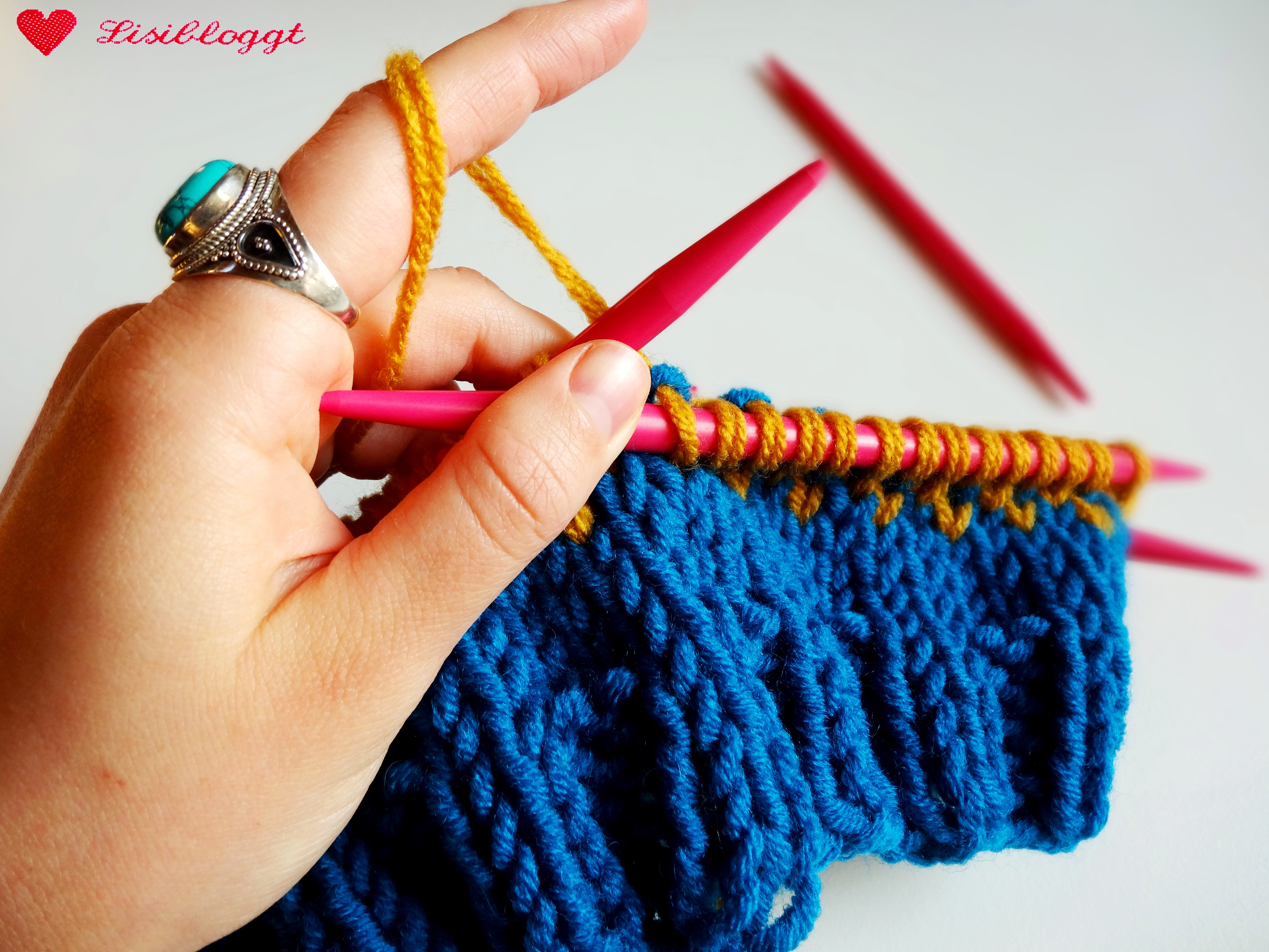 Die nächsten 4 Runden strickst Du glatt rechts, weiterhin in Petrol. Dann kommt eine Runde immer abwechselnd eine Masche in Petrol, eine in Senfgelb. Die nächste Runde strickst Du genauso immer eine Masche in Petrol und eine in Senfgelb im Wechsel – nur setzt du in dieser Runde auf jede gelbe Masche eine in Petrol und andersrum.