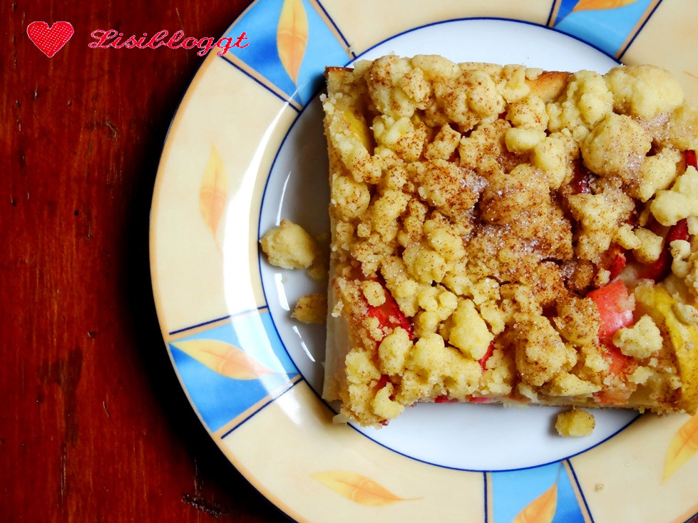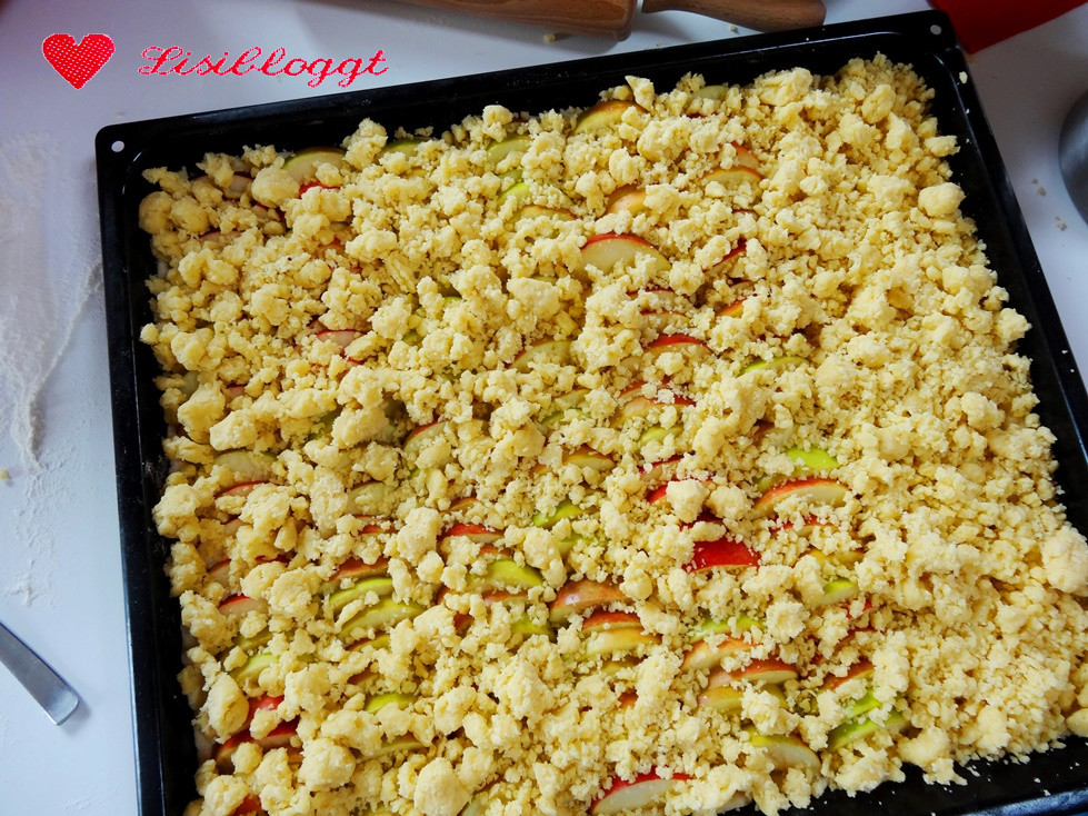 Wenn Du den Kuchen belegt hast, verteilst Du die Streusel gleichmäßig über dem Kuchen. Du kannst auch einen Streifen ohne Streusel lassen, dann ist es eben nur ein leckeres Stück Apfelkuchen ohne Streusel.