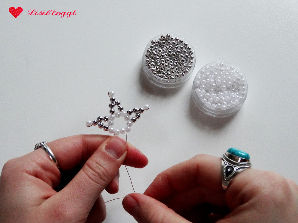 An den Perlenring werden nun Schritt für Schritt die einzelnen Zacken des Sterns (fünf Stück insgesamt) angefügt. Hierfür fädelst Du auf das lange Drahtstück drei Perlen von der anderen Farbe (bei mir silbern) und noch eine, in der gleichen Farbe wie der Perlenkreis in der Mitte (bei mir weiß).
