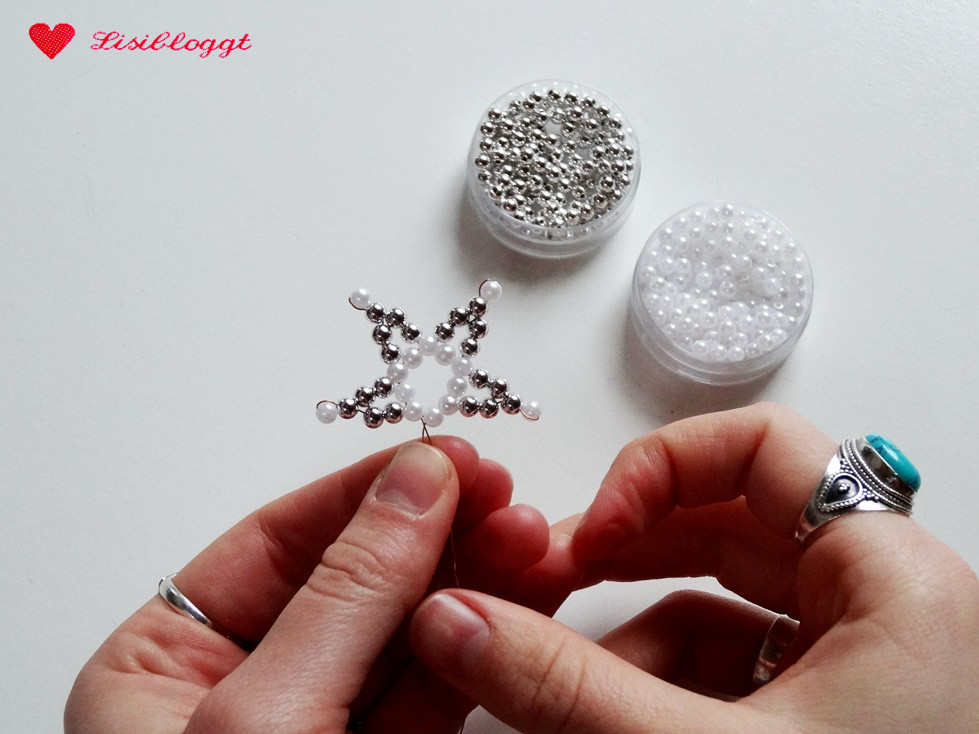 Mit den anderen Zacken machst Du dann genau so weiter: Drei silberne Perlen und eine weiße auffädeln, den Draht durch die vorletzte Perle zurückfädeln, zwei silberne Perlen auffädeln und den Draht wieder durch die übernächste Perle auf dem Perlenring fädeln.