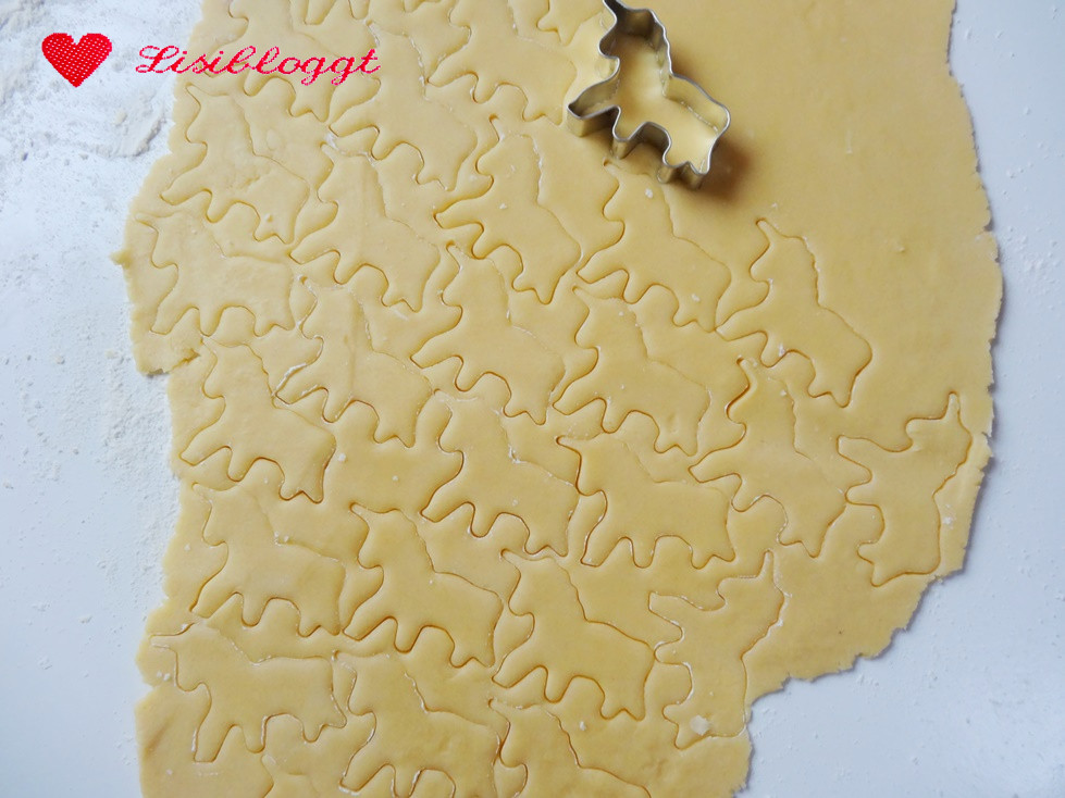 Sie sollten noch relativ hell sein, wenn Du sie aus dem Ofen nimmst und Du solltest sie unbedingt auf dem Blech ein wenig auskühlen lassen, sonst brechen sie leicht. Die Teigreste verknetest Du wieder zu einem neuen Teig und rollst so lange aus, stichst aus und verknetest wieder neu, bis eben kein Teig mehr übrig ist.