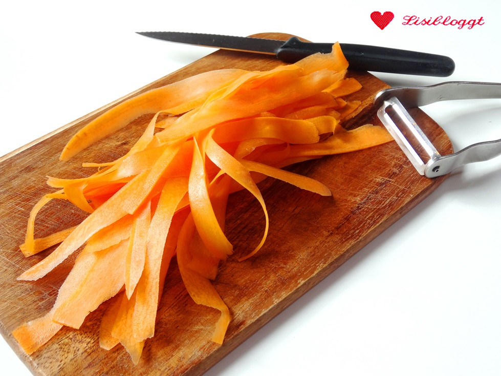 Die Karotten werden zuerst geschält und dann mit dem Sparschäler in dünne Streifen geschnitten. Das hat den Vorteil, dass alles Gemüse im Wok dann gleichzeitig gar wird. Sonst brauchen die Karotten immer etwas länger als Paprika oder Auberginen.
