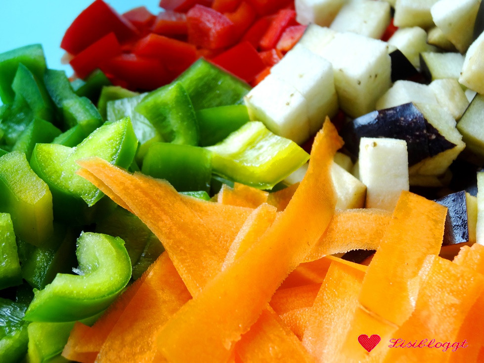 Die beiden Paprikaschoten und die Aubergine werden in kleine Würfel geschnitten – am besten gleich groß, damit sie auch zur gleichen Zeit durch werden. Die Zwiebeln und den Ingwer schneidest Du in kleine Würfelchen.