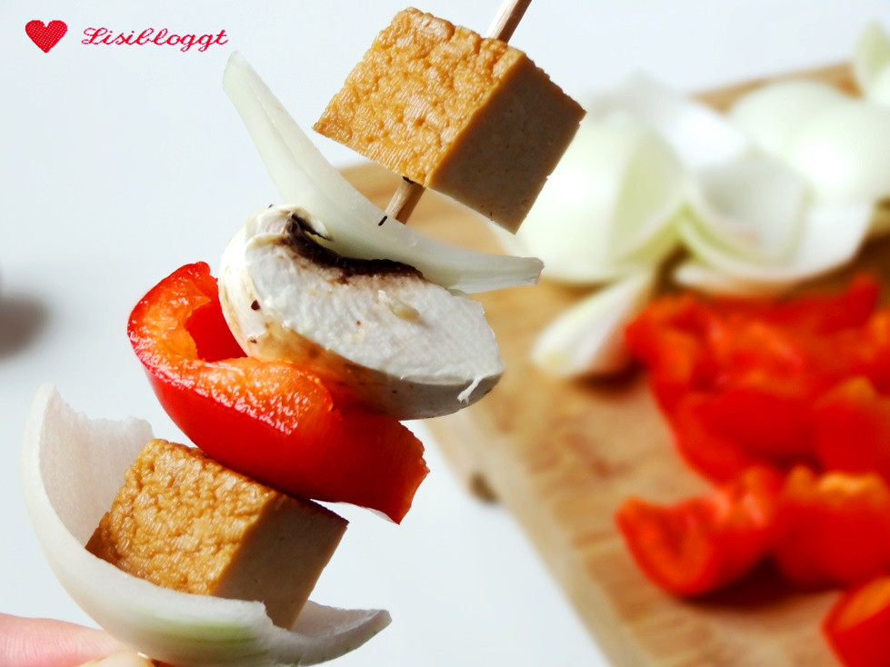 Lisitipp: Für solche Spieße kannst Du nehmen, was Dir eben so einfällt, was Du magst oder was der Kühlschrank hergibt: Aubergine, Zucchini, kleine gekochte Kartoffeln … Wichtig finde ich immer Zwiebeln, Knoblauch und ordentlich Gewürze in der Marinade. Sonst schmeckt das Gemüse schnell fad.