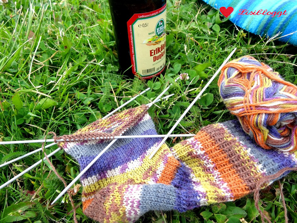 … und bis die Sonne untergeht, kann man noch ein bisschen stricken – Socken zum Beispiel. Die kann man praktischerweise immer noch irgendwie in die Tasche reinzwängen, egal wie wenig Platz ist.