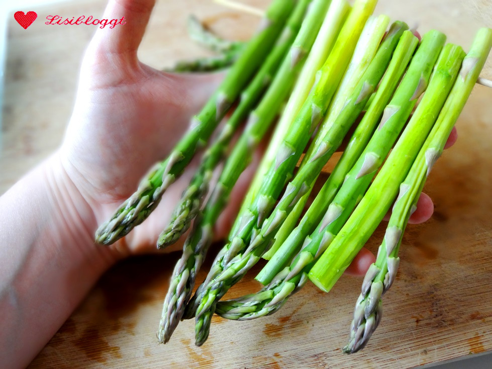 Den Spargel musst Du erst mal waschen und schälen (ca. 300 g). Weißen Spargel bis zur Spitze, grünen Spargel nur am unteren Drittel. Meine besten Tipps zu Spargel findest Du in meinem Ofenspargel-Rezept.
