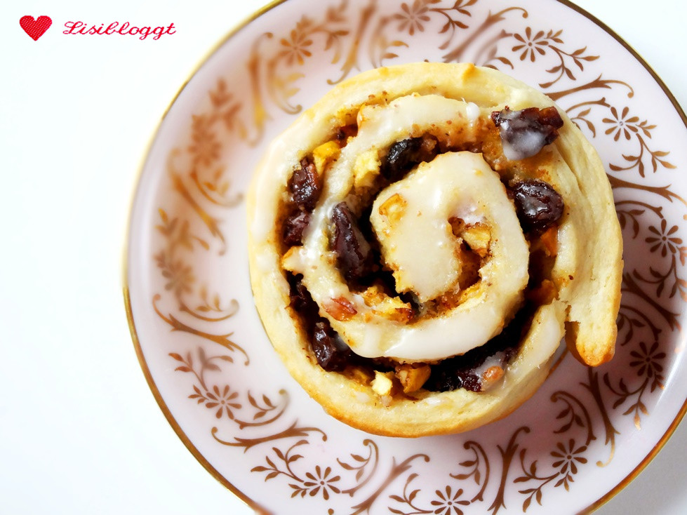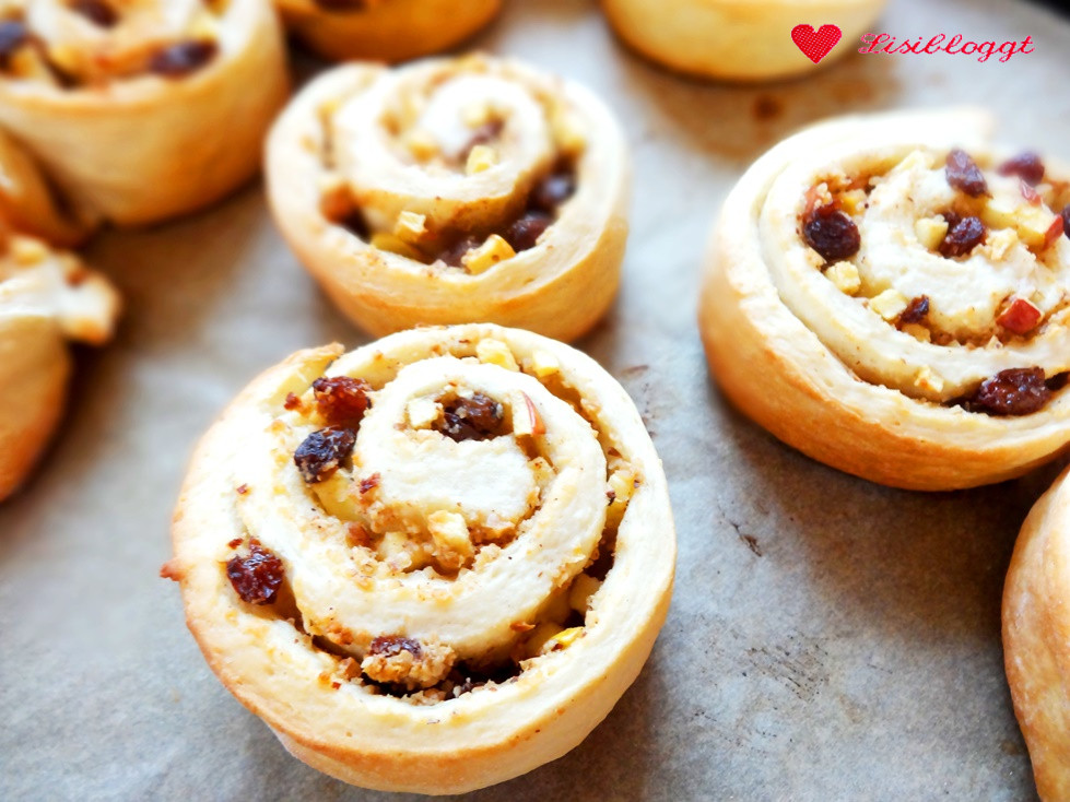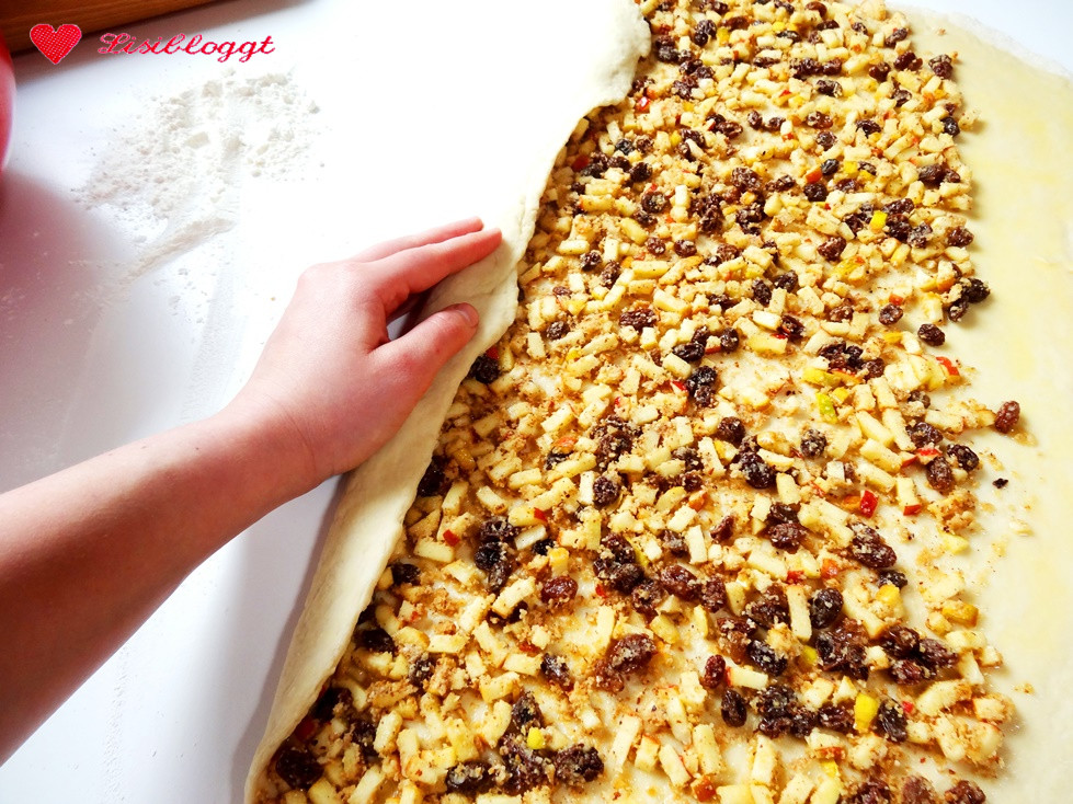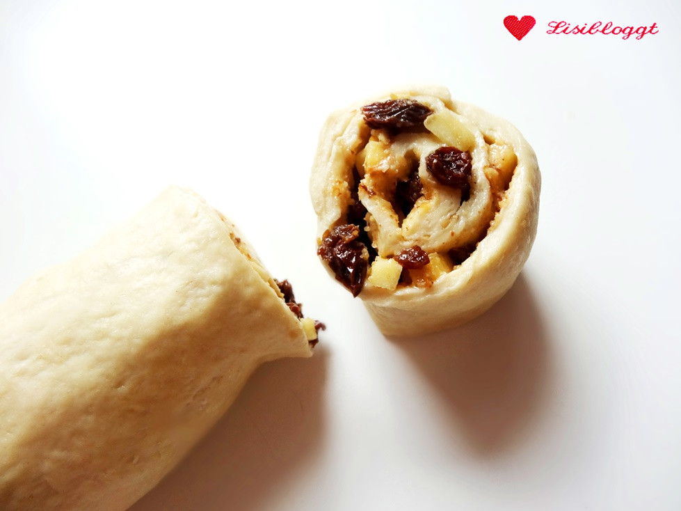 Für die Füllung kann ich mir auch sehr gut nur Nüsse vorstellen. Die Äpfel und die Rosinen machen alles eben ein bisschen saftiger. Eine Füllung mit kleinen Schoko-Splittern wäre sicher auch fein oder Marmelade. Fruchtig-säuerliche Himbeermarmelade zum Beispiel.