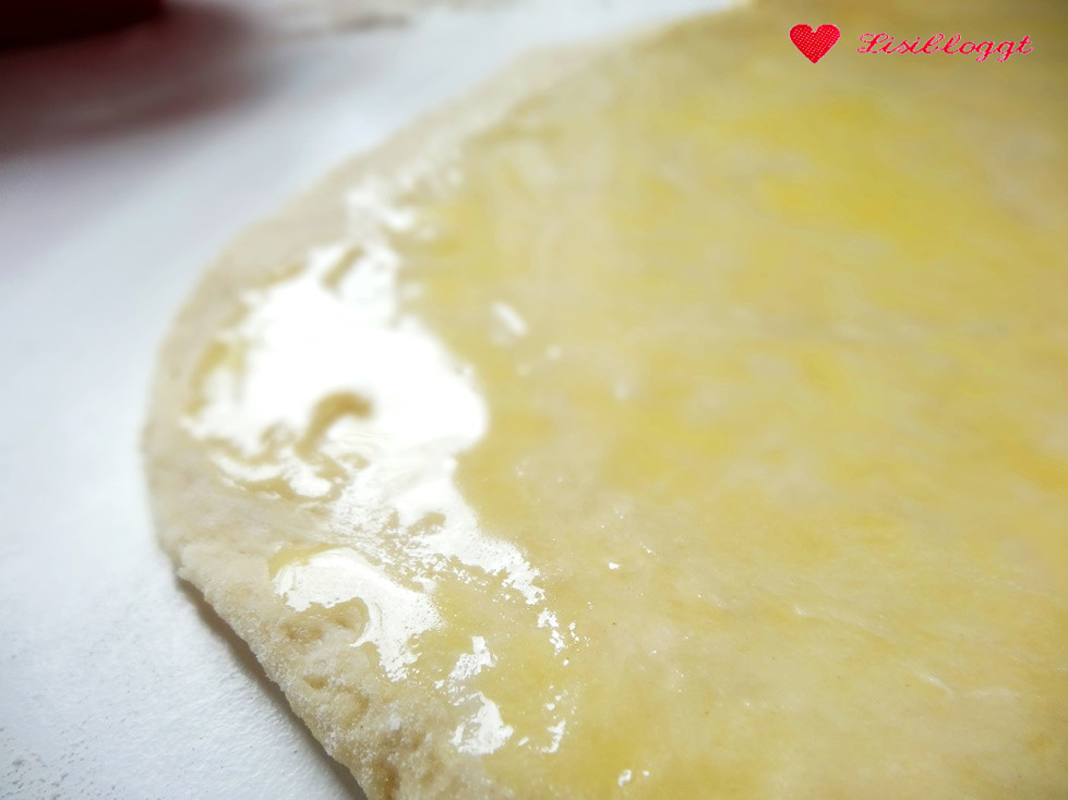 Das Hefeteig-Stück, das Du ausrollst sollte rechteckig sein und ca. so breit, wie Dein Unterarm lang ist. Wenn Du es ca. 2cm dick ausgerollt hast, passt es.