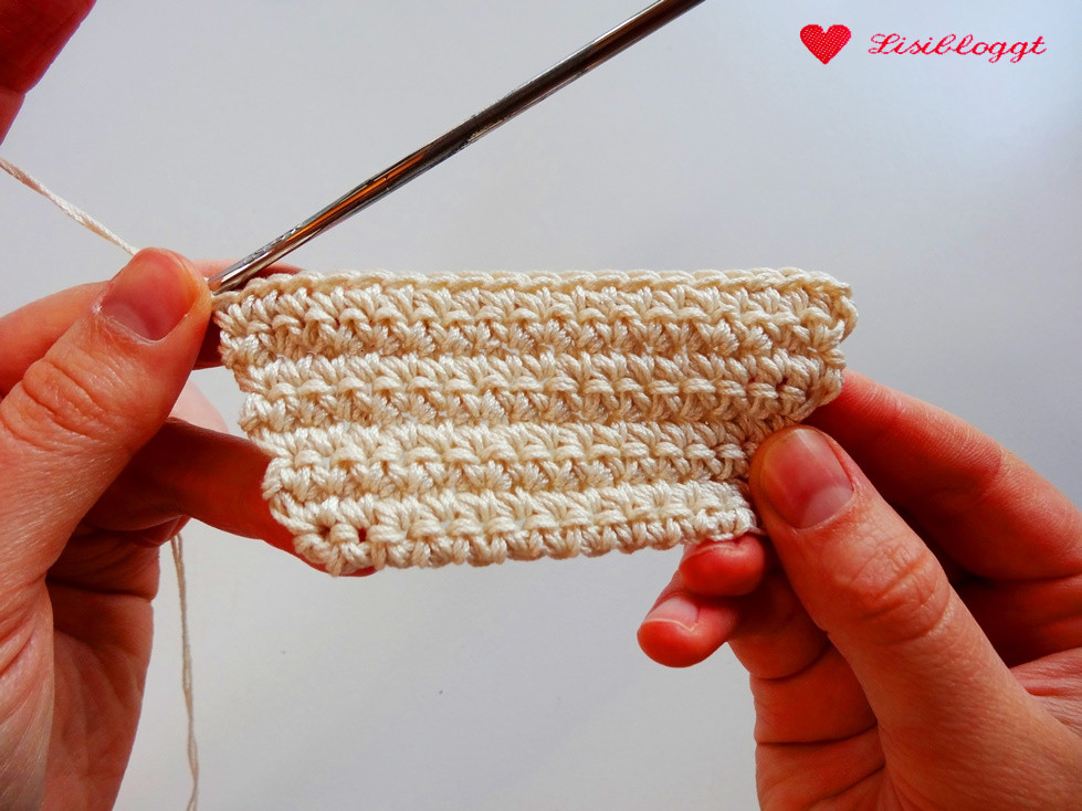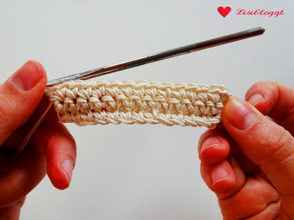 Damit sich das Häkelstück nach und nach verbreitert, häkelst Du in den ersten 4 Reihen jeweils 3 Maschen statt einer in die mittlere Masche der Reihe.