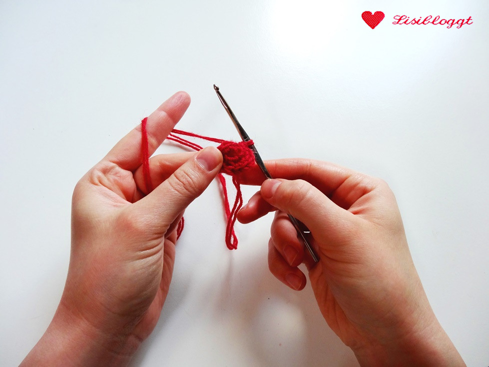 Für die Kirsche schlägst Du also im roten Garn wieder einen 6er Maschenring an, diesmal häkelst Du aber natürlich in Runden.Anleitung: Cupcake-Applikation häkeln
