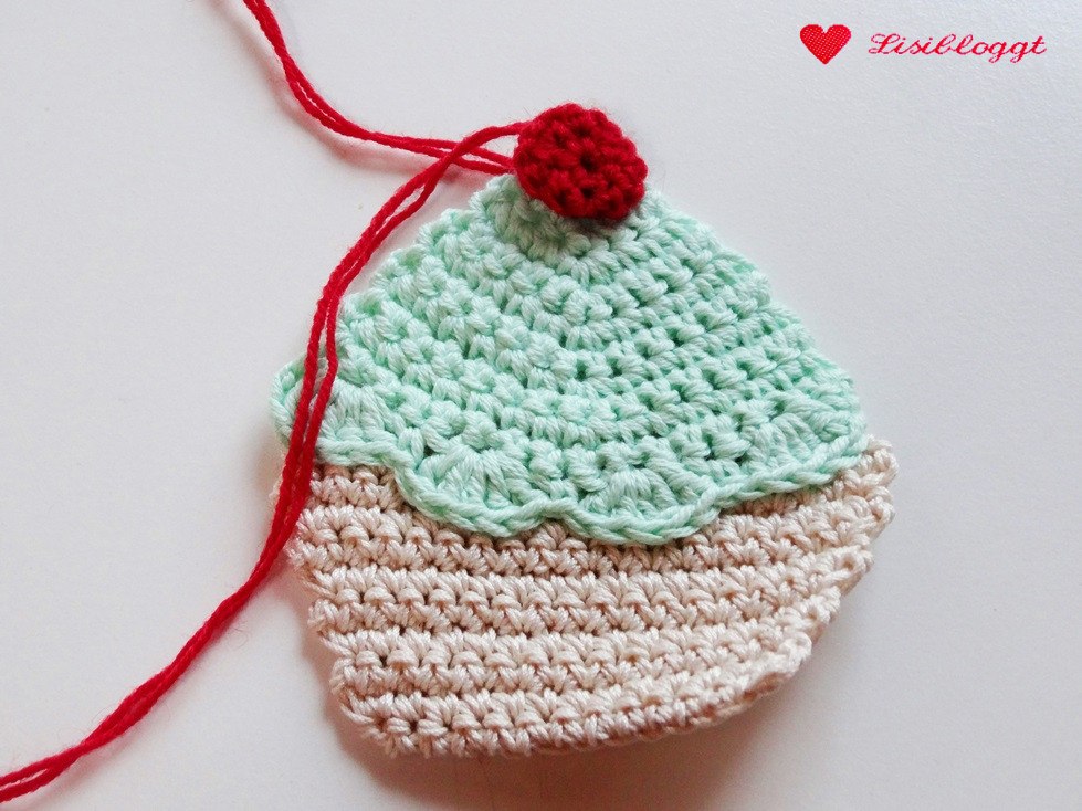 Wenn Du den Arbeitsfaden abschneidest und ihn durch die letzte Masche ziehst, lässt Du genügend Spielraum übrig, damit Du die Kirsche damit annähen kannst.Anleitung: Cupcake-Applikation häkeln