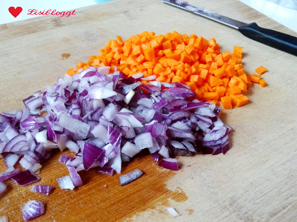 Für die Krautwickelchen schnappst Du Dir jetzt die Zwiebel und die Karotte. Erst wird beides geschält, dann in feine Würfelchen geschnitten.