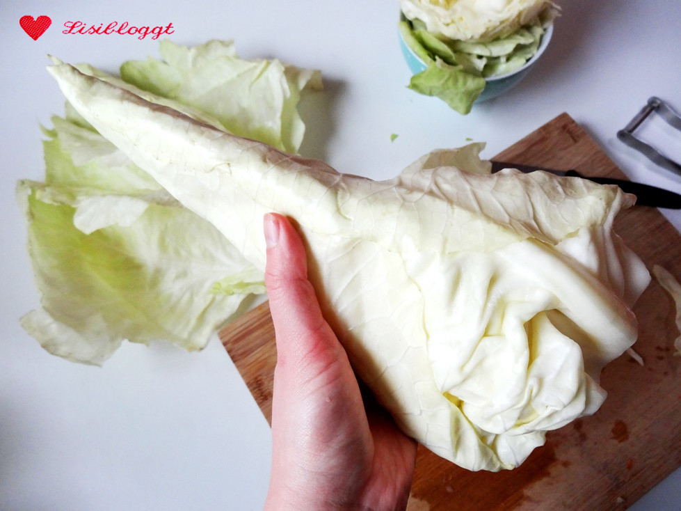 Dann schneidest Du unten den Strunk des Kohls großzügig ab und wickelst vorsichtig 10 Blätter ab (sie sollten am besten auch nur minimale Risse haben, damit die Füllung später nirgends rausfallen kann).