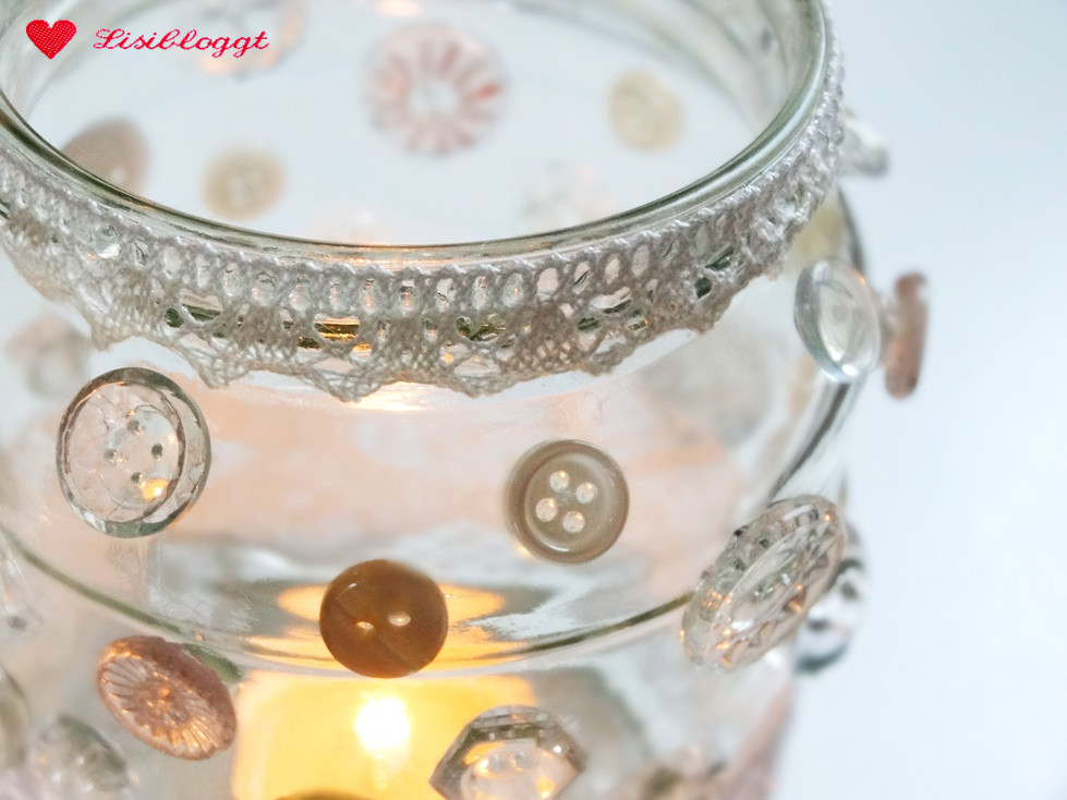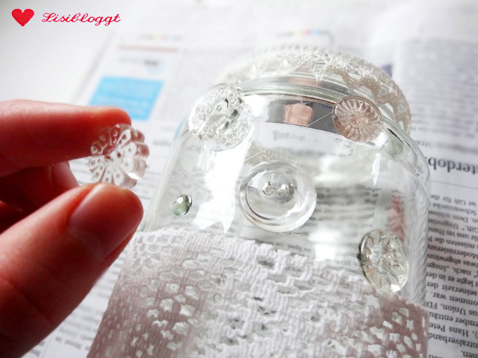 Also kommen jetzt die Knöpfe, die Du wild durcheinander mit Kleber-Klecksen oberhalb der breiten Spitzenborte auf das Glas klebst.