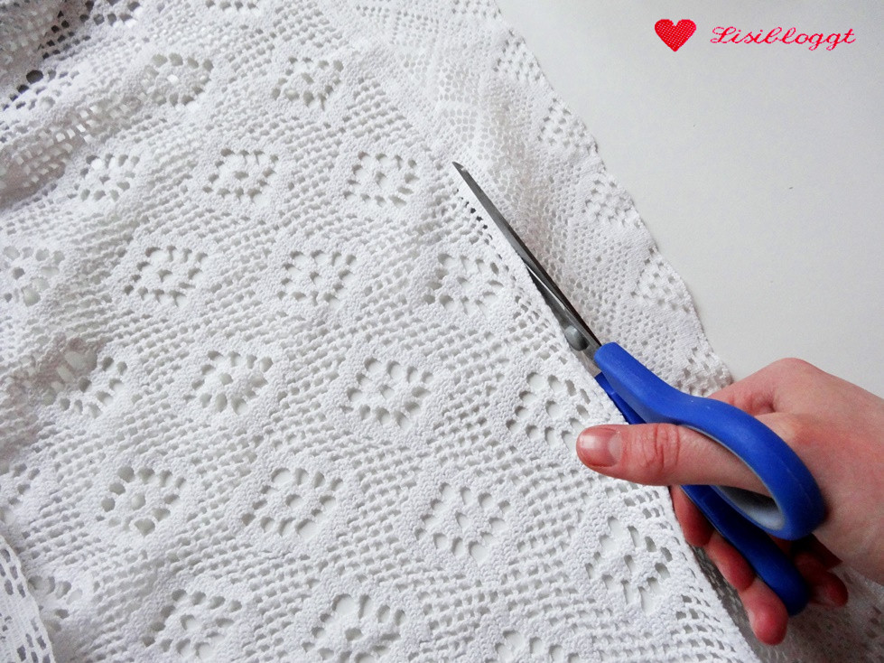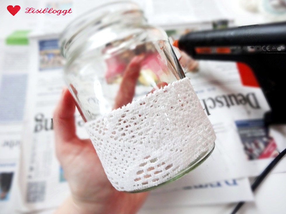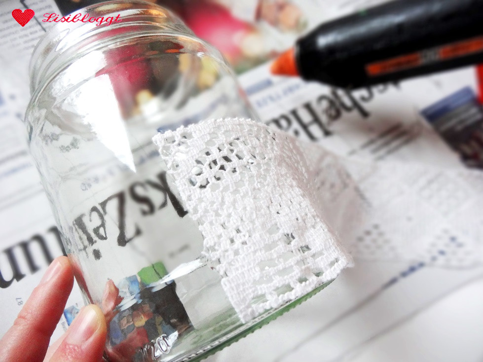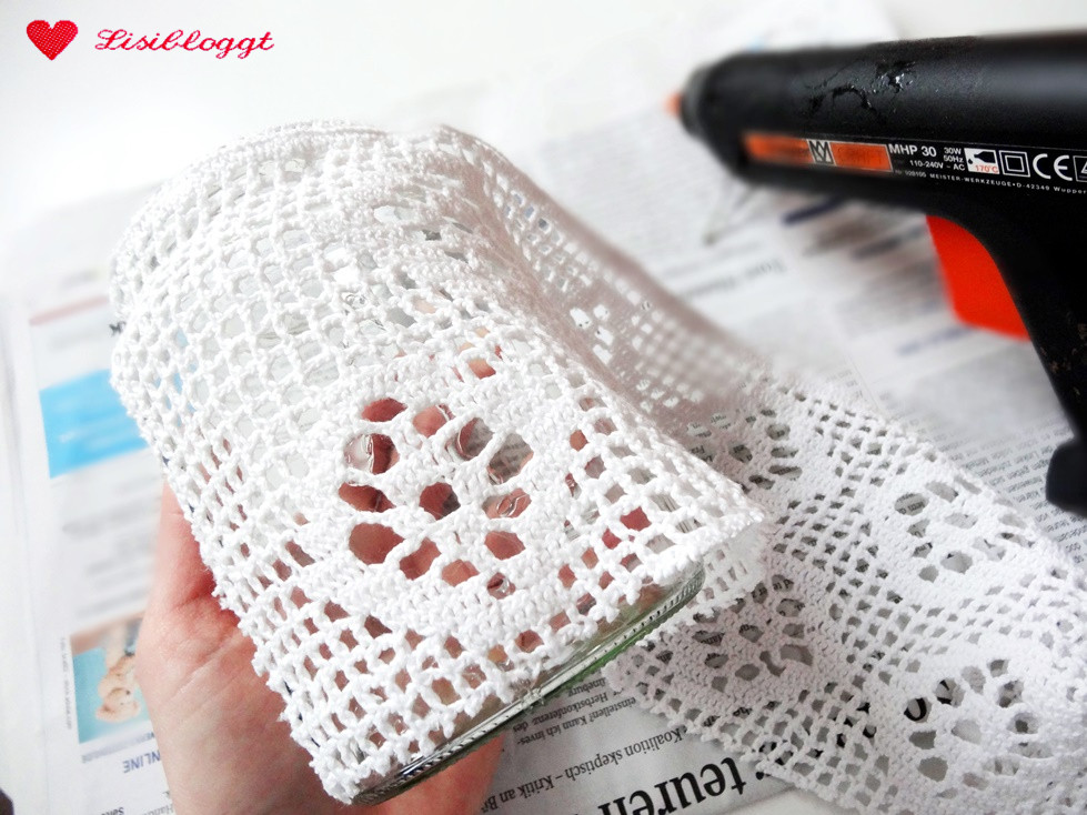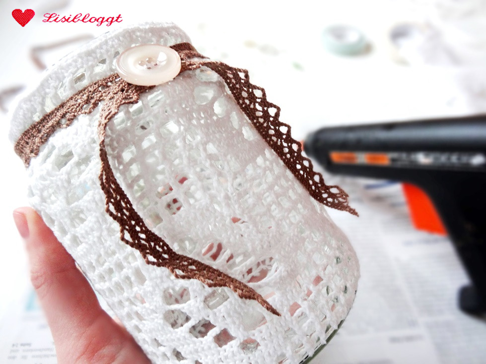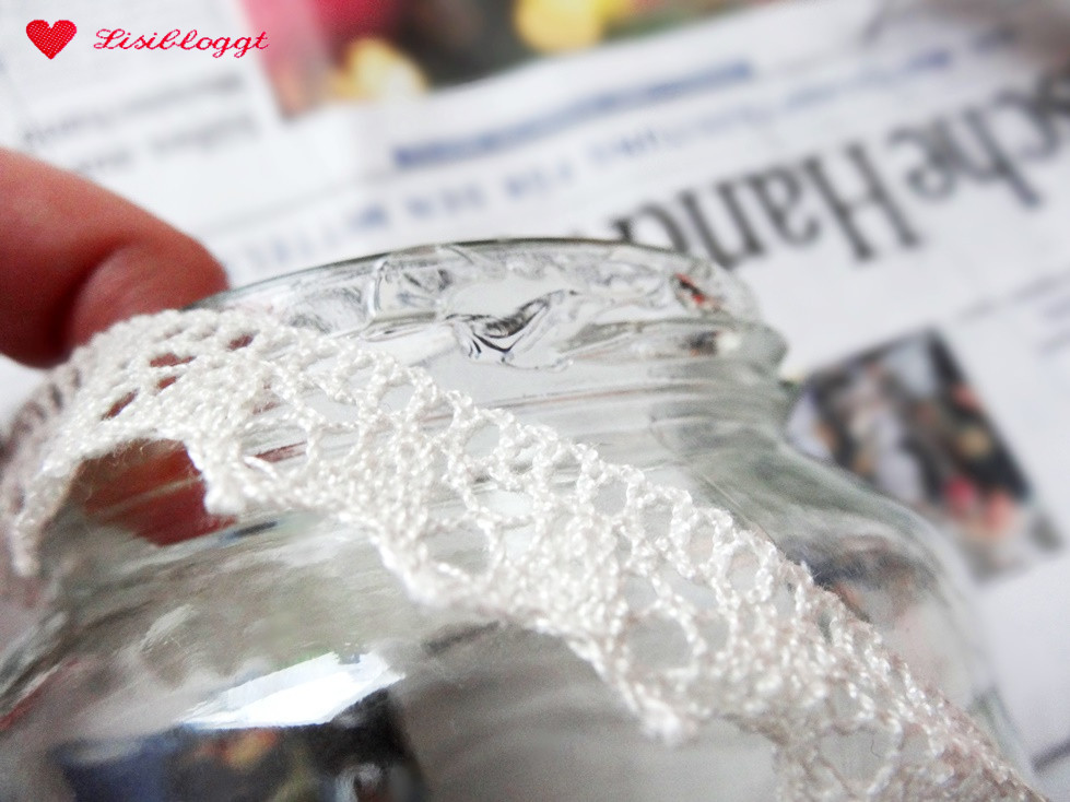 Die zweite Variante ist noch viel simpler: Du schneidest einfach ein Stück vom Spitzenstoff (bzw. bei mir: Von der alten Häkel-Tischdecke) ab, das komplett das Glas von oben bis unten bedeckt.